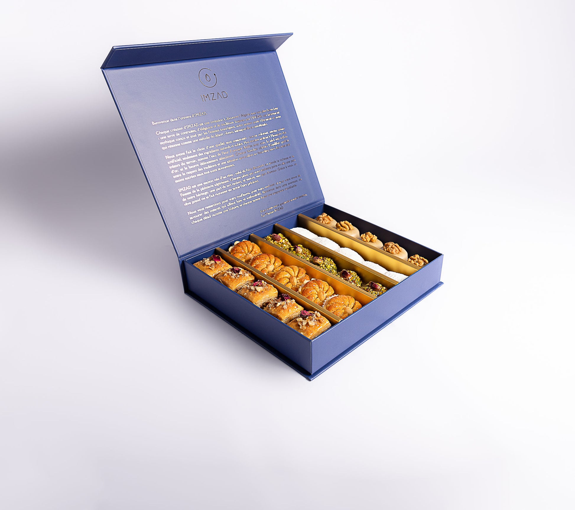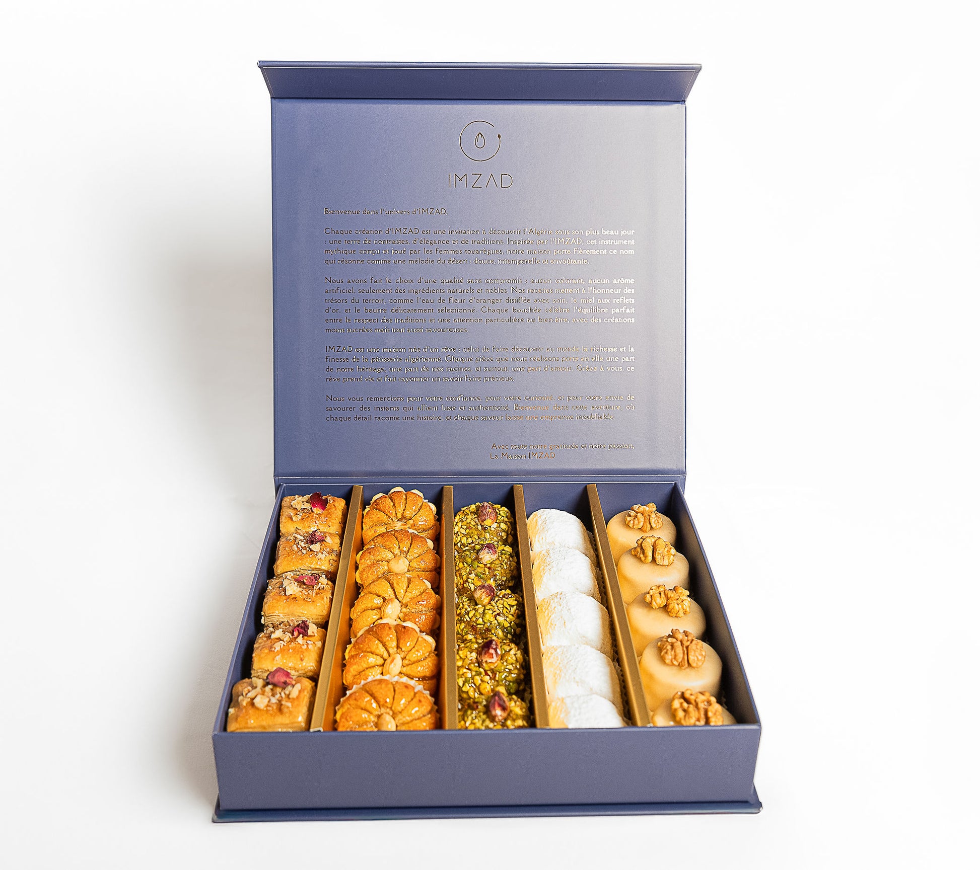 Partagez un assortiment original de mignardises raffinées, à base d’amande, de pistache et de noix. Présenté dans un coffret aimanté de luxe, subtilement estampé de touches dorées.